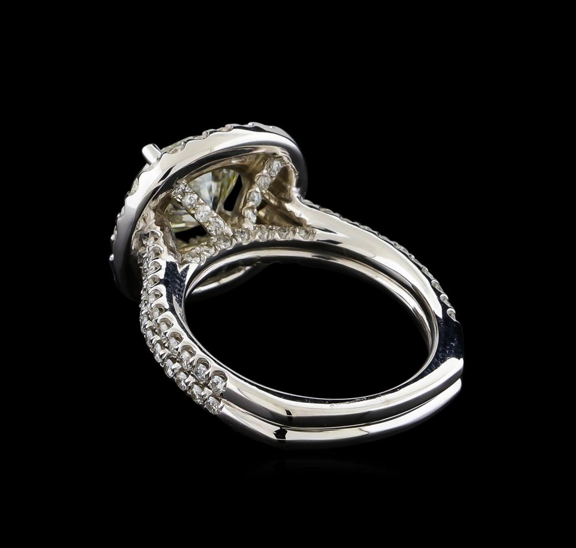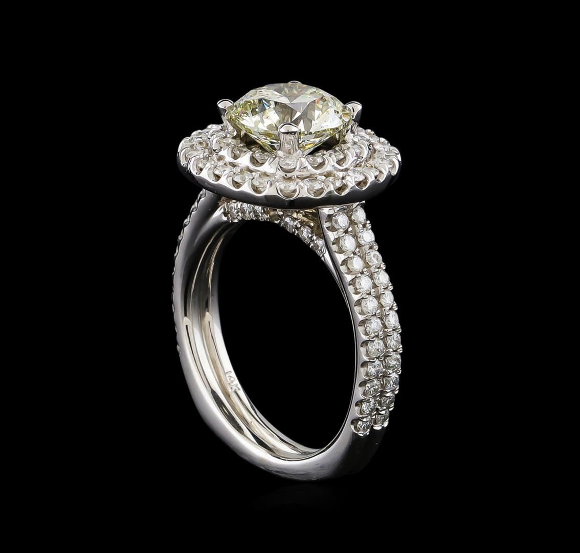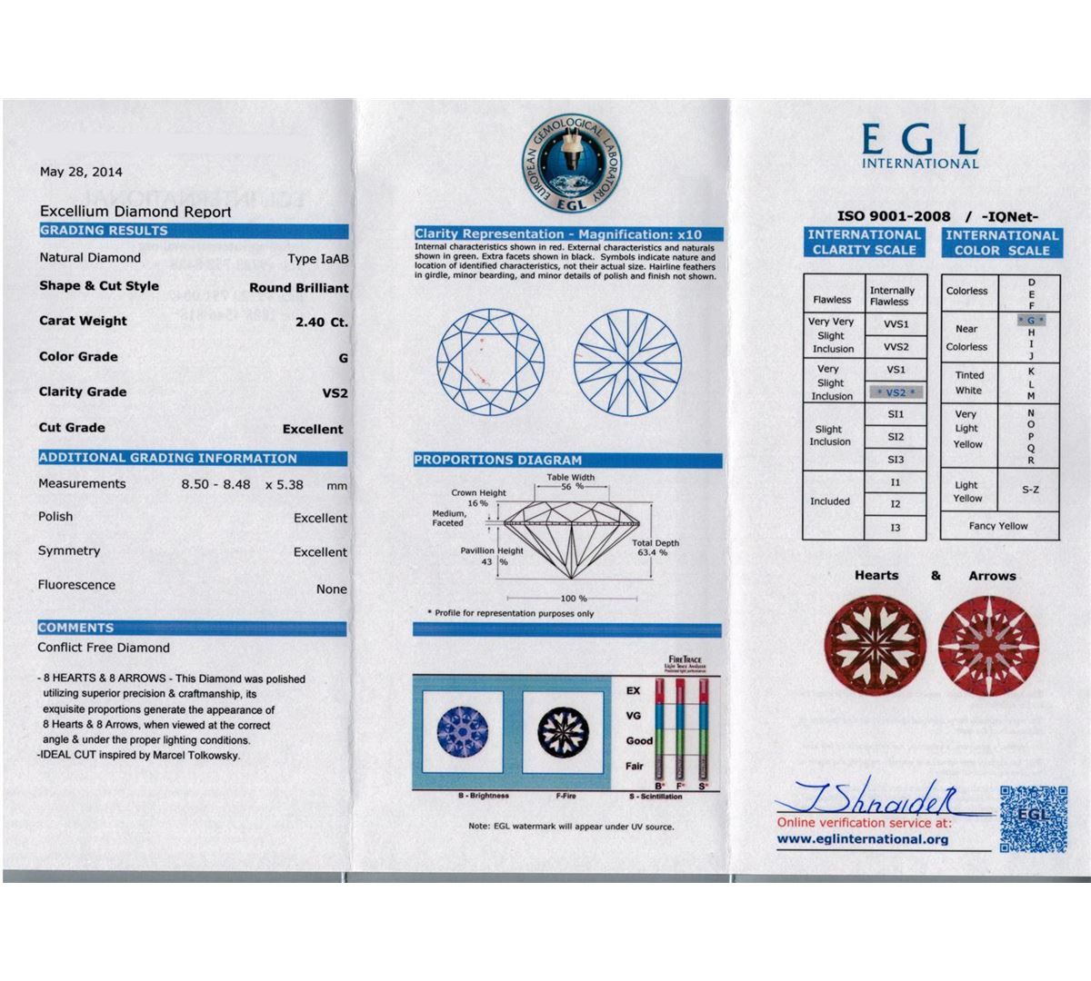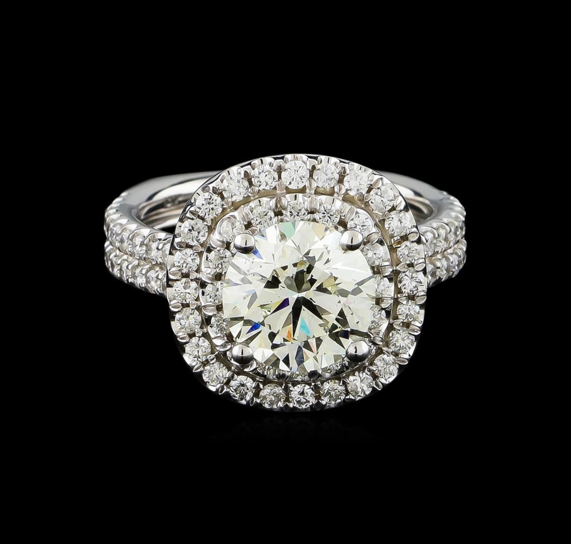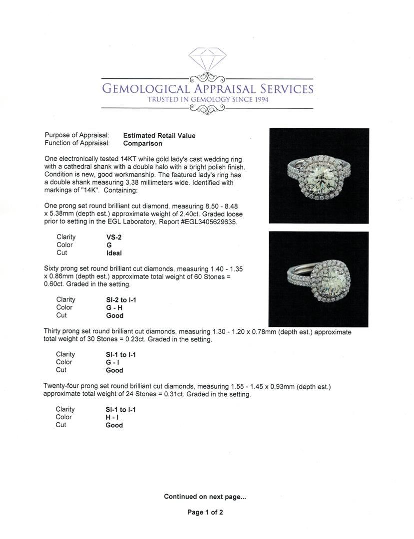 One electronically tested 14KT white gold lady's cast wedding ring with a cathedral shank with a double halo with a bright polish finish. The featured lady's ring has a double shank measuring 3.38 millimeters wide. Identified with markings of "14K". Condition is new, good workmanship. Containing: One prong set round brilliant cut diamond, measuring 8.50 - 8.48 x 5.38mm (depth est.) approximate weight of 2.40ct. Graded loose prior to setting in the EGL Laboratory, Report #EGL3405629635. Clarity: VS-2. Color: Ideal Sixty prong set round brilliant cut diamonds, measuring 1.40 - 1.35 x 0.86mm (depth est.) approximate total weight of 60 Stones = 0.60ct. Graded in the setting. Clarity: SI-2 to I-1. Color: G - Good Thirty prong set round brilliant cut diamonds, measuring 1.30 - 1.20 x 0.78mm (depth est.) approximate total weight of 30 Stones = 0.23ct. Graded in the setting. Clarity: SI-1 to I-1. Color: G - I. Cut Good Twenty-Four prong set round brilliant cut diamonds, measuring 1.55 - 1.45 x 0.93mm (depth est.) approximate total weight of 24 Stones = 0.31ct. Graded in the setting. Clarity: SI-1 to I-1. Color: H - I. Cut Good. Total Weight of Diamonds 3.54ct. Total Weight of Ring 7.70gm GAS Appraised at $81,240.00.