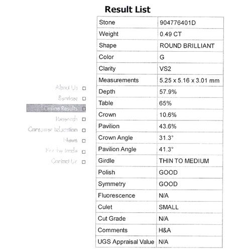 EGL Certified 0.49 ct ROUND BRILLIANT G, VS2 **|**|** Certification: EGL ; CTW: 0.49 ; Cut: Round Brilliant ; Diamond Color: G ; Diamond Clarity: VS2 ; Cert Appr#: 904776401D ; MSRP: $2101