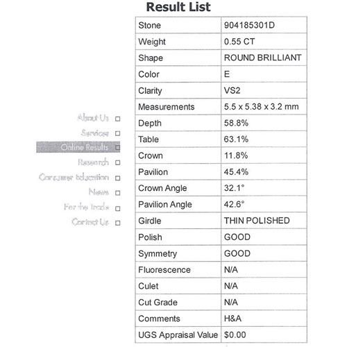 EGL Certified 0.55 ct ROUND BRILLIANT E, VS2 **|**|** Certification: EGL ; CTW: 0.55 ; Cut: Round Brilliant ; Diamond Color: E ; Diamond Clarity: VS2 ; Cert Appr#: 904185301D ; MSRP: $4716