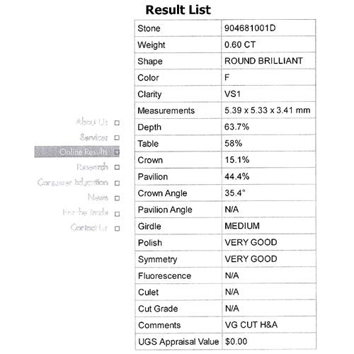 EGL Certified 0.60 ct ROUND BRILLIANT F, VS1 **|**|** Certification: EGL ; CTW: 0.6 ; Cut: Round Brilliant ; Diamond Color: F ; Diamond Clarity: VS1 ; Cert Appr#: 904681001D ; MSRP: $6174
