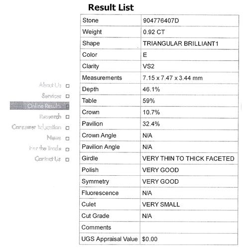 EGL Certified 0.92 ct TRIANGULAR BRILLIANT 1 E, VS2 **|**|** Certification: EGL ; CTW: 0.92 ; Cut: Triangular Brilliant ; Diamond Color: E ; Diamond Clarity: VS2 ; Cert Appr#: 904776407D ; MSRP: $15778