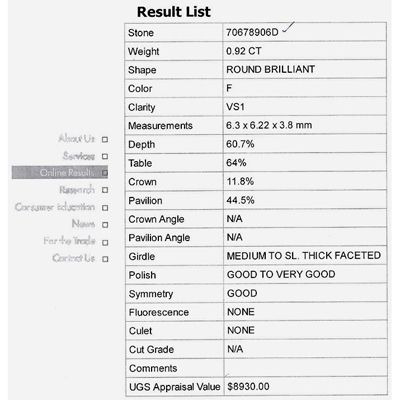 EGL Certified 0.92ct Round Brilliant F, VS1 **|**|** EGL Certified ; Round Brilliant ; F, VS1 ; 0.92 ct ; MSRP: $8694