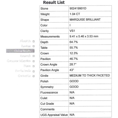 EGL Certified 1.04 ctw Marquise Brilliant Loose, I, VS **|**|** EGL Certified 1.04 ctw Marquise Brilliant Loose, I, VS1 Report#EGL 902419901D ; MSRP: $5026