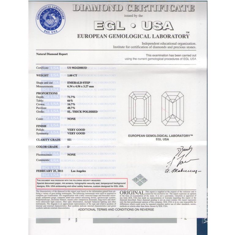 EGL Certified Diamond Cushion 1.00ctw D,SI1 **|**|** Shape: Cushion ; Carat: 1.00 ; Color: D ; Clarity: SI1 ; Dimension: 6.34x4.56x3.27 ; Certification: EGL USA ; Depth: 71.1 ; Table: 66 ; MSRP: $5500