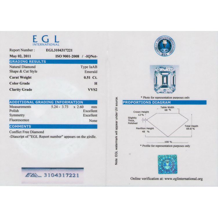EGL Certified Diamond Emerald 0.51ctw H,VVS2 **|**|** Shape: Emerald ; Carat: 0.51 ; Color: H ; Clarity: VVS2 ; ; MSRP: $1200