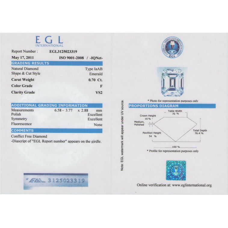 EGL Certified Diamond Emerald 0.70ctw F,VS2 **|**|** Shape: Emerald ; Carat: 0.70 ; Color: F ; Clarity: VS2 ; Dimension: 6.58x3.77x2.88 ; Certification: EGL ISRAEL ; Depth: 76.4 ; Table: 70 ; Gridle: Medium ; MSRP: $2300