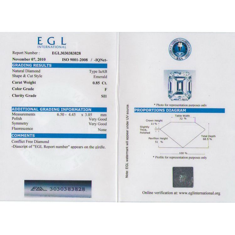 EGL Certified Diamond Emerald 0.85ctw F,SI1 **|**|** Shape: Emerald ; Carat: 0.85 ; Color: F ; Clarity: SI1 ; Dimension: 6.50x4.45x3.05 ; Certification: EGL ISRAEL ; Depth: 68.5 ; Table: 72 ; MSRP: $2700