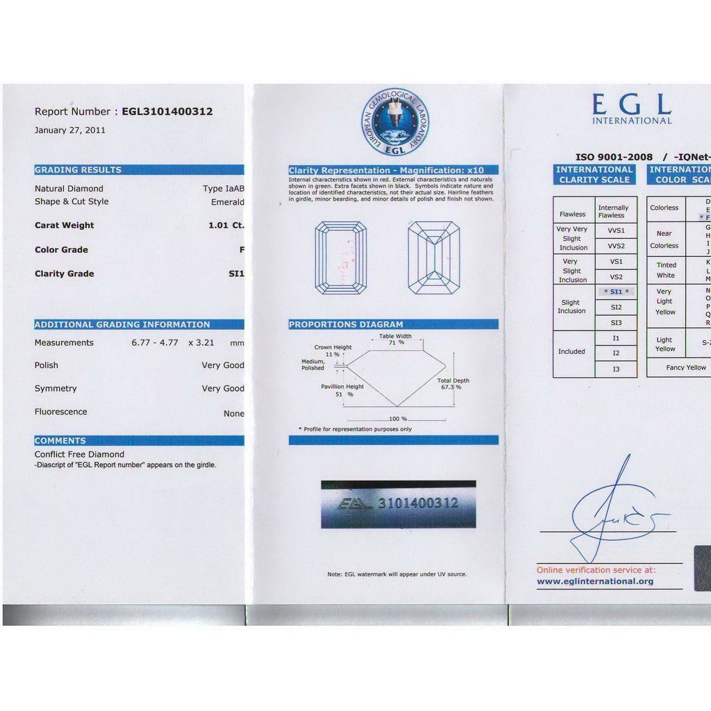 EGL Certified Diamond Emerald 1.01ctw F,SI1 **|**|** Shape: Emerald ; Carat: 1.01 ; Color: F ; Clarity: SI1 ; Dimension: 6.77x4.77x3.21 ; Certification: EGL ISRAEL ; Depth: 67.3 ; Table: 71 ; Gridle: Medium ; MSRP: $4500