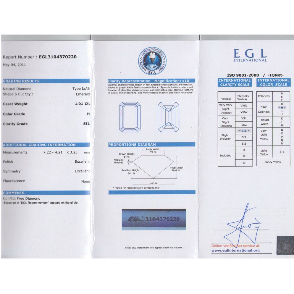 EGL Certified Diamond Emerald 1.01ctw H,SI1 **|**|** Shape: Emerald ; Carat: 1.01 ; Color: H ; Clarity: SI1 ; Dimension: 7.22x4.21x3.23 ; Certification: EGL ISRAEL ; Depth: 76.6 ; Table: 59 ; Gridle: Medium ; MSRP: $3200