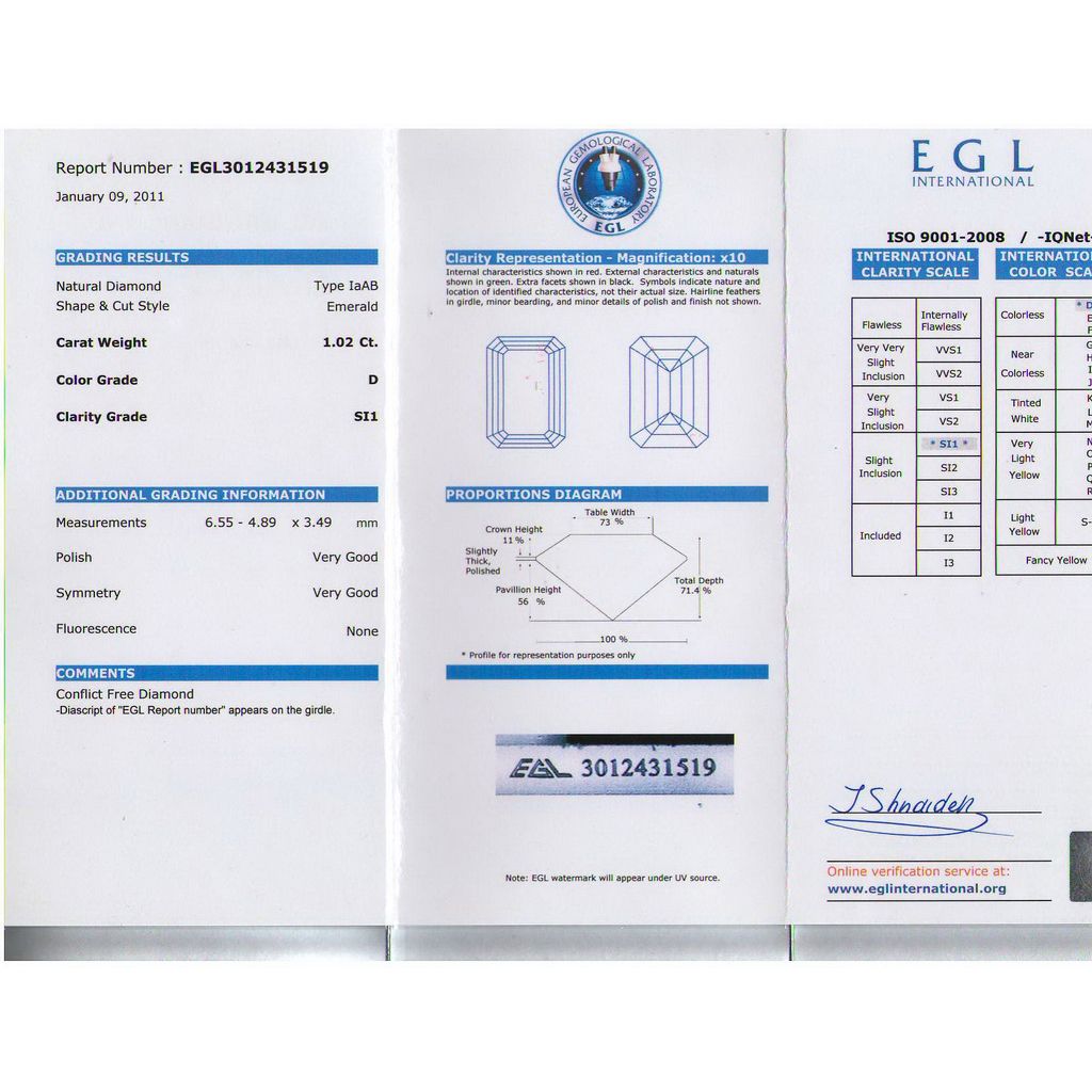 EGL Certified Diamond Emerald 1.02ctw D,SI1 **|**|** Shape: Emerald ; Carat: 1.02 ; Color: D ; Clarity: SI1 ; Dimension: 6.55x4.89x3.49 ; Certification: EGL ISRAEL ; Depth: 71.4 ; Table: 73 ; MSRP: $5000