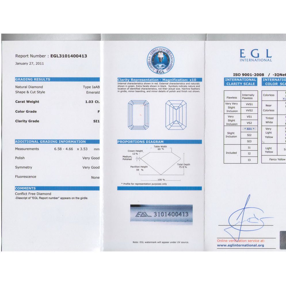 EGL Certified Diamond Emerald 1.03ctw F,SI1 **|**|** Shape: Emerald ; Carat: 1.03 ; Color: F ; Clarity: SI1 ; Dimension: 6.58x4.66x3.53 ; Certification: EGL ISRAEL ; Depth: 75.9 ; Table: 69 ; Gridle: Medium ; MSRP: $4600