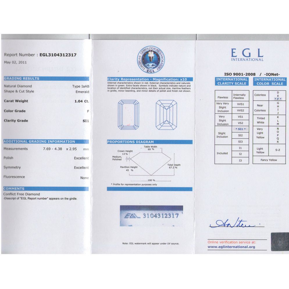 EGL Certified Diamond Emerald 1.04ctw F,SI1 **|**|** Shape: Emerald ; Carat: 1.04 ; Color: F ; Clarity: SI1 ; Dimension: 7.69x4.38x2.95 ; Certification: EGL ISRAEL ; Depth: 67.2 ; Table: 69 ; Gridle: Medium ; MSRP: $4600