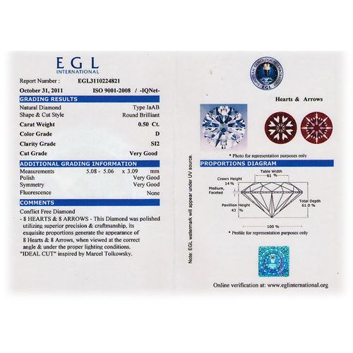 EGL Certified Diamond Round 0.50 ctw D,SI2 **|**|** Shape: Round ; Carat: 0.50 ; Color: D ; Clarity: SI2 ; Dimension: 5.06-5.08x3.09 ; Certification: EGL ISRAEL ; Depth: 61 ; Table: 61 ; Gridle: Medium ; MSRP: $2500