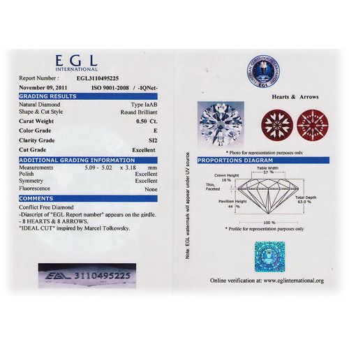 EGL Certified Diamond Round 0.50 ctw E,SI2 **|**|** Shape: Round ; Carat: 0.50 ; Color: E ; Clarity: SI2 ; Dimension: 5.02-5.09x3.18 ; Certification: EGL ISRAEL ; Depth: 63 ; Table: 57 ; MSRP: $2400