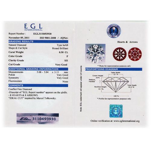 EGL Certified Diamond Round 0.50 ctw F,SI1 **|**|** Shape: Round ; Carat: 0.50 ; Color: F ; Clarity: SI1 ; Dimension: 5.04-5.08x3.15 ; Certification: EGL ISRAEL ; Depth: 62.2 ; Table: 57 ; Gridle: Medium ; MSRP: $2600