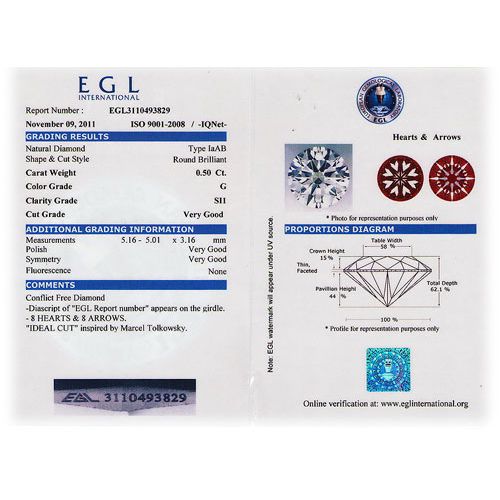 EGL Certified Diamond Round 0.50 ctw G,SI1 **|**|** Shape: Round ; Carat: 0.50 ; Color: G ; Clarity: SI1 ; Dimension: 5.01-5.16x3.16 ; Certification: EGL ISRAEL ; Depth: 62.1 ; Table: 58 ; MSRP: $2400