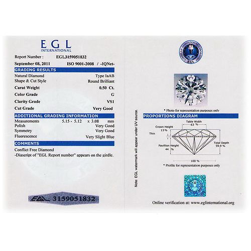 EGL Certified Diamond Round 0.50 ctw G,VS1 **|**|** Shape: Round ; Carat: 0.50; Color: G ; Clarity: VS1 ; Dimension: 5.12-5.15x3.08 ; Certification: EGL ISRAEL ; Depth: 59.9 ; Table: 63 ; Gridle: Thin ; MSRP: $3400