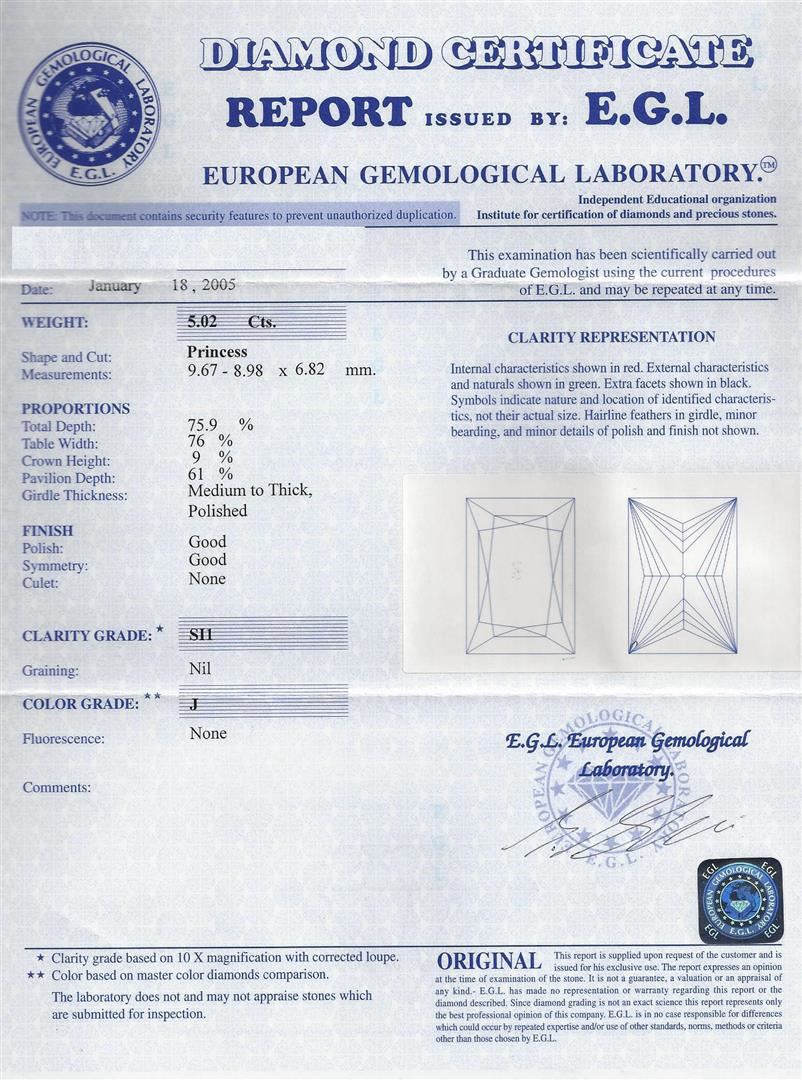 One EGL International Certified 18KT white and yellow gold ladies ring (15.90 grams). Containing: One princess cut diamond measuring 9.67 x 8.98 x 6.82mm weighing 5.02ct. Clarity: SI1. Color: J. Symmetry & Polish: Good/Good. The ring also features 22 round, brilliant cut diamonds with a total weight of 0.68ct. Average quality is: SI1 clarity grade; fancy yellow color. 68 round, brilliant cut diamonds with a total weight of 2.10ct. Average quality is: SI1 clarity grade; G color grade. GLS Appraised at $82,300.00.