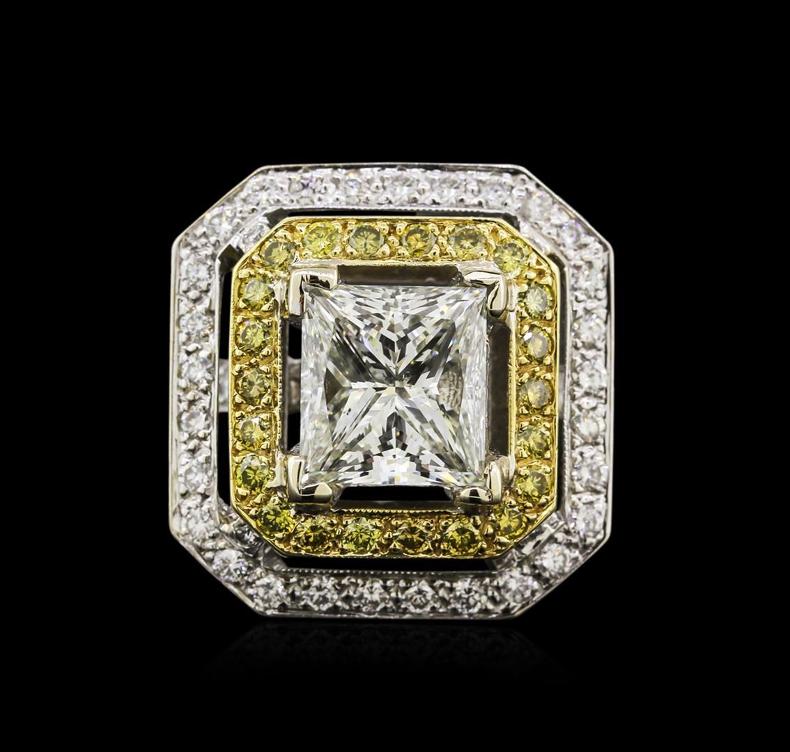 One EGL International Certified 18KT white and yellow gold ladies ring (15.90 grams). Containing: One princess cut diamond measuring 9.67 x 8.98 x 6.82mm weighing 5.02ct. Clarity: SI1. Color: J. Symmetry & Polish: Good/Good. The ring also features 22 round, brilliant cut diamonds with a total weight of 0.68ct. Average quality is: SI1 clarity grade; fancy yellow color. 68 round, brilliant cut diamonds with a total weight of 2.10ct. Average quality is: SI1 clarity grade; G color grade. GLS Appraised at $82,300.00.