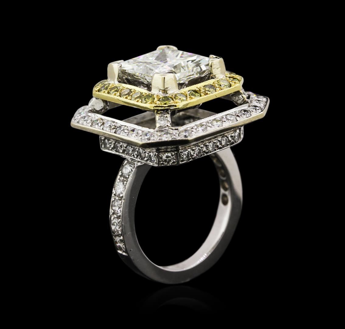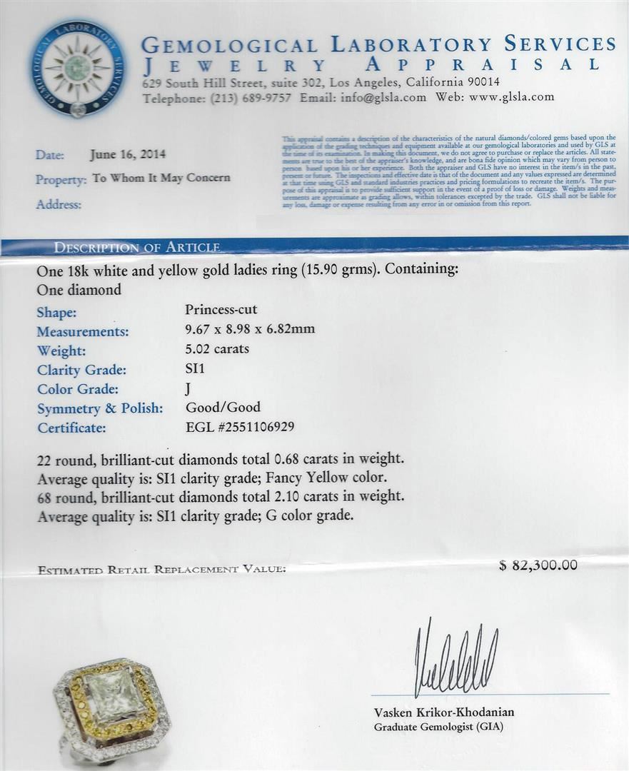 One EGL International Certified 18KT white and yellow gold ladies ring (15.90 grams). Containing: One princess cut diamond measuring 9.67 x 8.98 x 6.82mm weighing 5.02ct. Clarity: SI1. Color: J. Symmetry & Polish: Good/Good. The ring also features 22 round, brilliant cut diamonds with a total weight of 0.68ct. Average quality is: SI1 clarity grade; fancy yellow color. 68 round, brilliant cut diamonds with a total weight of 2.10ct. Average quality is: SI1 clarity grade; G color grade. GLS Appraised at $82,300.00.