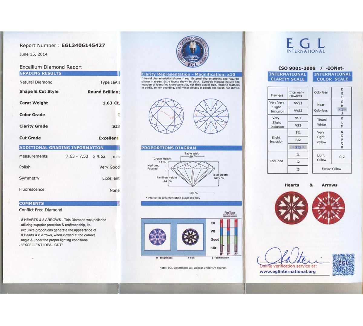 One polished, stamped, and tested 14K yellow gold ring mounted with: 1 genuine diamond center stone weighing 1.63 carat, and 30 genuine round diamonds weighing 1.09 carats. This item weighs 3.7 grams, condition is new, excellent workmanship. Main Gemstone: EGL Report No.: EGL3406145427. Identity: Natural Diamond. Shape: Round. Cutting Style: Brilliant Cut. Measurements: 7.63-7.53 x 4.62 mm. Weight: 1.63 carat. Color Grade: I. Clarity Grade: SI3. Polish: Very Good. Symmetry: Excellent. Refractive Index: 2.417. Hardness: 10. Adjacent Gemstones On Ring: Identity: Natural Diamond. Cut: Round Brilliant. Quantity: 30 Diamonds. Measurements: 1.7-2.5 mm. Total Weight: 1.09 carats. Color Grade: F-G. Clarity Grade: SI1-SI3. Refractive Index 2.418. Hardness: 10. Center Diamond Weight: 1.63ct. Total Diamond Weight: 2.72cts. Weight of Item: 3.7 grams. Gold Content: 14K Yellow Gold. AIGL Appraised at $27,750.00.