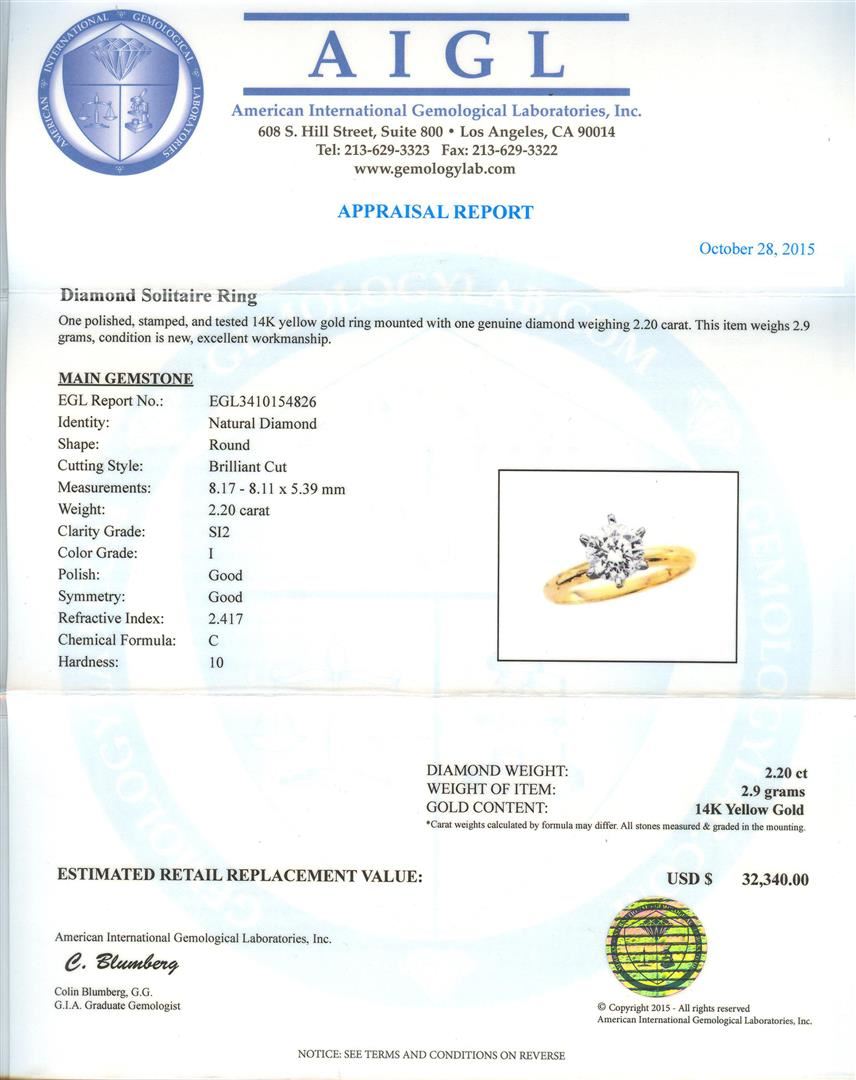 One polished, stamped, and tested 14K yellow gold ring mounted with one genuine diamond weighing 2.20 carat. This item weighs 2.9 grams, condition is new, excellent workmanship. Main Gemstone: EGL Report No.: EGL3410154826. Identity: Natural Diamond. Shape: Round. Cutting Style: Brilliant Cut. Measurements: 2.17 - 8.11 x 5.39 mm. Weight: 2.20 carat. Clarity Grade: SI2. Color Grade: I. Polish: Good. Symmetry: Good. Refractive Index: 2.417. Chemical Formula: C. Hardness: 10. Diamond Weight: 2.20ct. Weight of Item: 2.9 grams. Gold Content: 14K Yellow Gold. AIGL Appraised at $32,340.00.