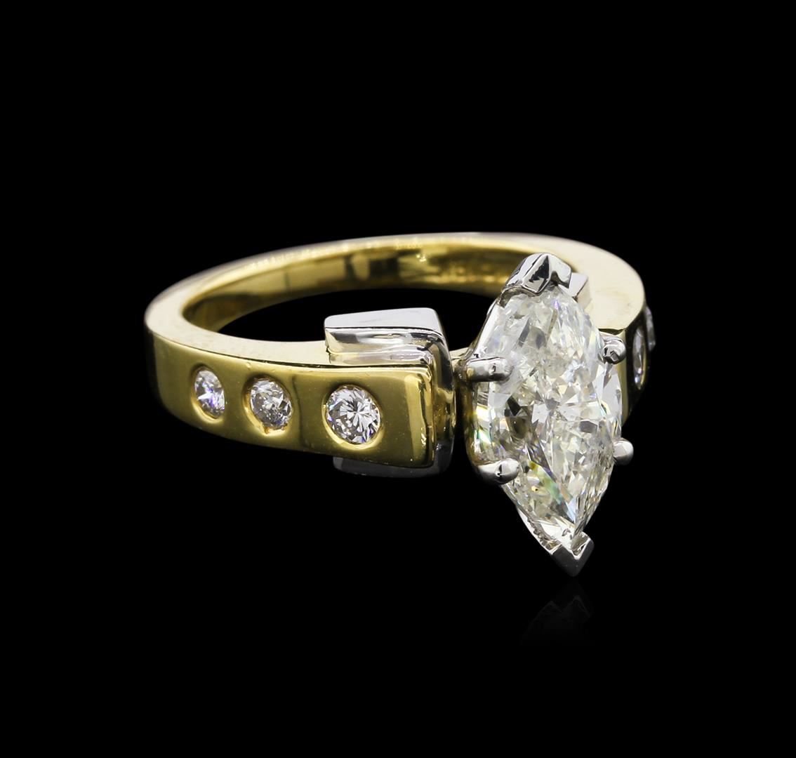 One polished, stamped, and tested 18K yellow & white gold ring mounted with: 1 genuine diamond center stone weighing 2.01 carat, and 6 genuine round diamonds weighing 0.25 carats. This item weighs 9.0 grams, condition is new, excellent workmanship. Main Gemstone: EGL Report No.: EGL3410154827. Identity: Natural Diamond. Shape: Marquise. Cutting Style: Brilliant Cut. Measurements: 11.31 - 5.90 x 4.57 mm. Weight: 2.01 carat. Color Grade: H. Clarity Grade: SI2. Polish: Good. Symmetry: Very Good. Refractive Index: 2.417. Hardness: 10. Adjacent Gemstones On Ring: Identity: Natural Diamond. Shape: Round. Cutting Style: Brilliant Cut. Quantity: 6 Diamonds. Measurements: 2.0 - 2.7 mm. Total Weight: 0.25 carats. Color Grade: H. Clarity Grade: SI1 - SI2. Refractive Index: 2.418. Hardness: 10. Center Diamond Weight: 2.01ct. Total Diamond Weight: 2.26cts. Weight of Item: 9.0 grams. Gold Content: 18K Yellow & White Gold. AIGL Appraised at $15,790.00.