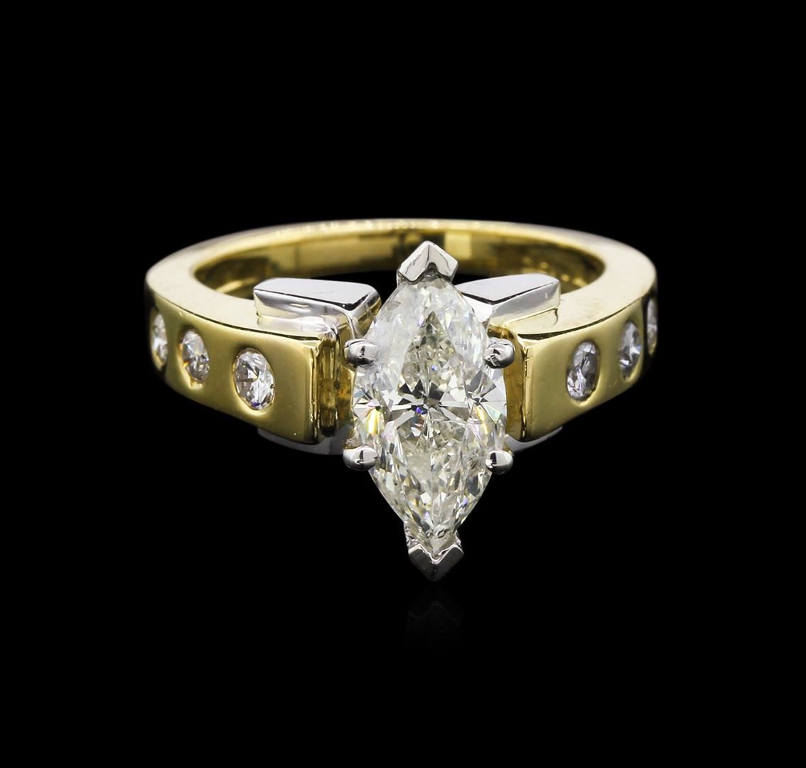 One polished, stamped, and tested 18K yellow & white gold ring mounted with: 1 genuine diamond center stone weighing 2.01 carat, and 6 genuine round diamonds weighing 0.25 carats. This item weighs 9.0 grams, condition is new, excellent workmanship. Main Gemstone: EGL Report No.: EGL3410154827. Identity: Natural Diamond. Shape: Marquise. Cutting Style: Brilliant Cut. Measurements: 11.31 - 5.90 x 4.57 mm. Weight: 2.01 carat. Color Grade: H. Clarity Grade: SI2. Polish: Good. Symmetry: Very Good. Refractive Index: 2.417. Hardness: 10. Adjacent Gemstones On Ring: Identity: Natural Diamond. Shape: Round. Cutting Style: Brilliant Cut. Quantity: 6 Diamonds. Measurements: 2.0 - 2.7 mm. Total Weight: 0.25 carats. Color Grade: H. Clarity Grade: SI1 - SI2. Refractive Index: 2.418. Hardness: 10. Center Diamond Weight: 2.01ct. Total Diamond Weight: 2.26cts. Weight of Item: 9.0 grams. Gold Content: 18K Yellow & White Gold. AIGL Appraised at $15,790.00.