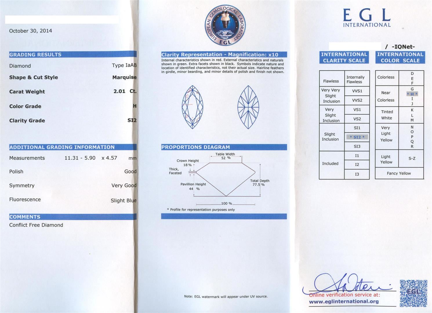 One polished, stamped, and tested 18K yellow & white gold ring mounted with: 1 genuine diamond center stone weighing 2.01 carat, and 6 genuine round diamonds weighing 0.25 carats. This item weighs 9.0 grams, condition is new, excellent workmanship. Main Gemstone: EGL Report No.: EGL3410154827. Identity: Natural Diamond. Shape: Marquise. Cutting Style: Brilliant Cut. Measurements: 11.31 - 5.90 x 4.57 mm. Weight: 2.01 carat. Color Grade: H. Clarity Grade: SI2. Polish: Good. Symmetry: Very Good. Refractive Index: 2.417. Hardness: 10. Adjacent Gemstones On Ring: Identity: Natural Diamond. Shape: Round. Cutting Style: Brilliant Cut. Quantity: 6 Diamonds. Measurements: 2.0 - 2.7 mm. Total Weight: 0.25 carats. Color Grade: H. Clarity Grade: SI1 - SI2. Refractive Index: 2.418. Hardness: 10. Center Diamond Weight: 2.01ct. Total Diamond Weight: 2.26cts. Weight of Item: 9.0 grams. Gold Content: 18K Yellow & White Gold. AIGL Appraised at $15,790.00.