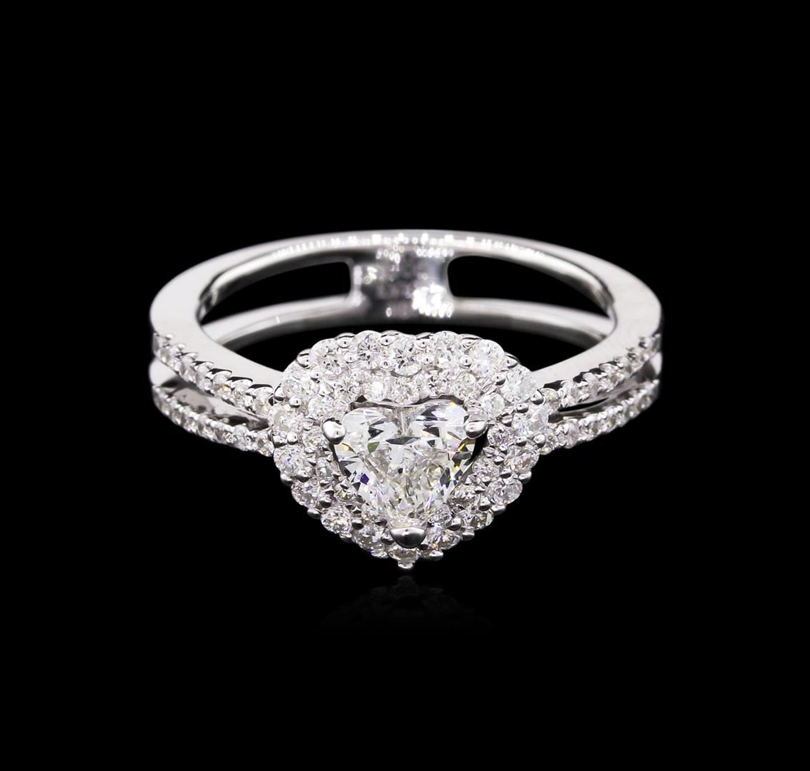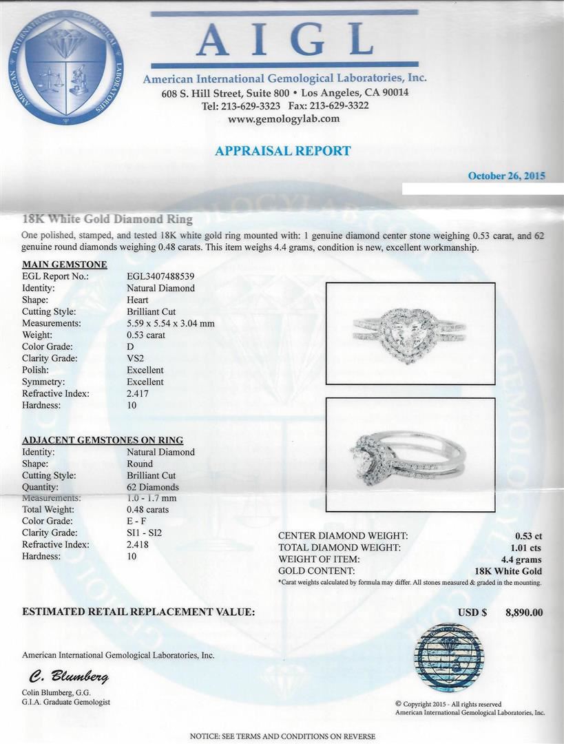 One polished, stamped, and tested 18K white gold ring mounted with: 1 genuine diamond center stone weighing 0.53 carat, and 62 genuine round diamonds weighing 0.48 carats. This item weighs 4.4 grams, condition is new, excellent workmanship. Main Gemstone: EGL Report No.: EGL3407488539. Identity: Natural Diamond. Shape: Heart. Cutting Style: Brilliant Cut. Measurements: 5.59 x 5.54 x 3.04 mm. Weight: 0.53 carat. Color Grade: D. Clarity Grade: VS2. Polish: Excellent. Symmetry: Excellent. Refractive Index: 2.417. Hardness: 10. Adjacent Gemstones On Ring: Identity: Natural Diamond. Shape: Round. Cutting Style: Brilliant Cut. Quantity: 62 Diamonds. Measurements: 1.0 - 1.7 mm. Total Weight: 0.48 carats. Color Grade: E-F. Clarity Grade: SI1-SI2. Refractive Index: 2.418. Hardness: 10. Center Diamond Weight: 0.53ct. Total Diamond Weight: 1.01cts. Weight Of Item: 4.4 grams. Gold Content: 18KT White Gold. AIGL Appraised.