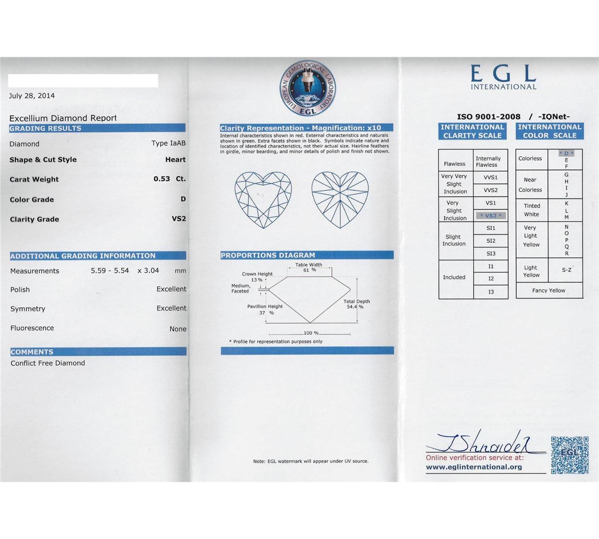 One polished, stamped, and tested 18K white gold ring mounted with: 1 genuine diamond center stone weighing 0.53 carat, and 62 genuine round diamonds weighing 0.48 carats. This item weighs 4.4 grams, condition is new, excellent workmanship. Main Gemstone: EGL Report No.: EGL3407488539. Identity: Natural Diamond. Shape: Heart. Cutting Style: Brilliant Cut. Measurements: 5.59 x 5.54 x 3.04 mm. Weight: 0.53 carat. Color Grade: D. Clarity Grade: VS2. Polish: Excellent. Symmetry: Excellent. Refractive Index: 2.417. Hardness: 10. Adjacent Gemstones On Ring: Identity: Natural Diamond. Shape: Round. Cutting Style: Brilliant Cut. Quantity: 62 Diamonds. Measurements: 1.0 - 1.7 mm. Total Weight: 0.48 carats. Color Grade: E-F. Clarity Grade: SI1-SI2. Refractive Index: 2.418. Hardness: 10. Center Diamond Weight: 0.53ct. Total Diamond Weight: 1.01cts. Weight Of Item: 4.4 grams. Gold Content: 18KT White Gold. AIGL Appraised.
