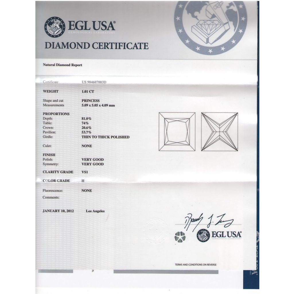 EGL USA 1.01 ctw Certified Princess Brilliant Diamond H **|**|** Certification: EGL USA; Total CTW: 1.01 ; Shape: Princess ; Color: H; Clarity: VS1 ; Pol: V G; Sym: V G; Flour: None ; Meas.: 5.09x5.05x4.09 ; Depth: 81 ; Table: 74 ; Girdle: Thin-Tck ; Comment: FULL OF LIFE ; MSRP: $9800