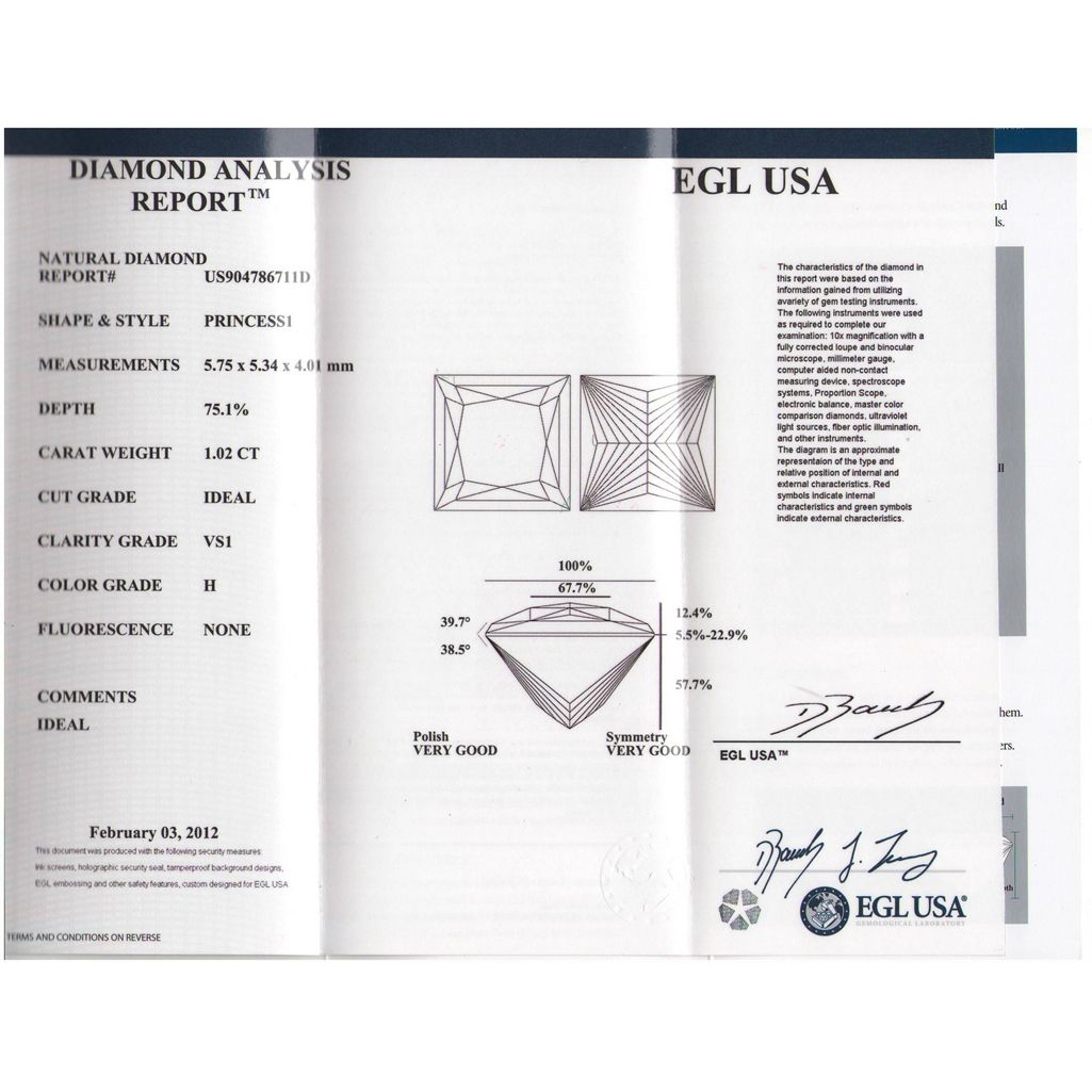 EGL USA 1.02 ctw Certified Princess Brilliant Diamond H **|**|** Certification: EGL USA; Total CTW: 1.02 ; Shape: Princess ; Color: H; Clarity: VS1 ; Pol: V G; Sym: V G; Flour: None ; Meas.: 5.75x5.34x4.01 ; Depth: 75.1 ; Table: 68 ; Girdle: V Thin ; Comment: IDEAL ; MSRP: $10900