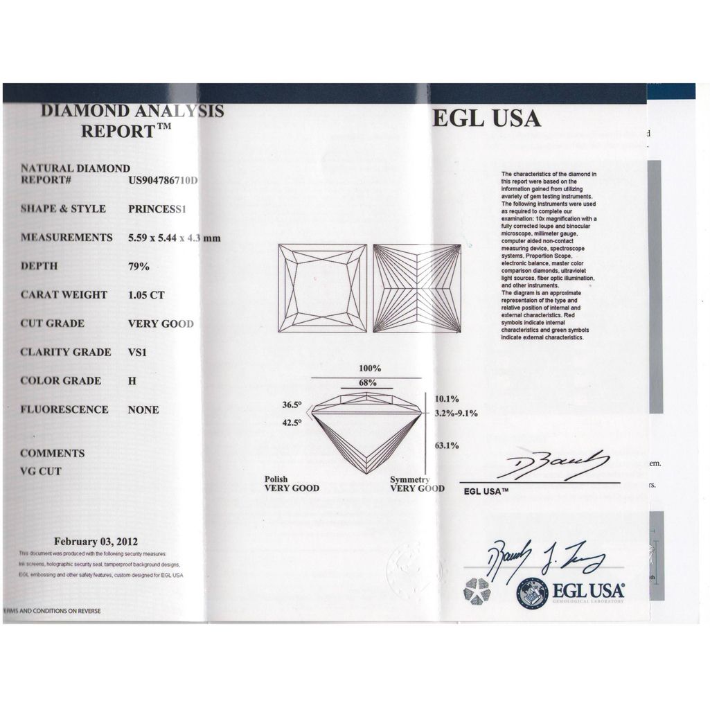 EGL USA 1.04 ctw Certified Princess Brilliant Diamond H **|**|** Certification: EGL USA; Total CTW: 1.04 ; Shape: Princess ; Color: H; Clarity: VS1; Cut: V G ; Pol: V G; Sym: V G; Flour: None ; Meas.: 5.59x5.44x4.30 ; Depth: 79 ; Table: 68 ; Girdle: Med-Tck ; Comment: VG CUT GRADE ; MSRP: $11200