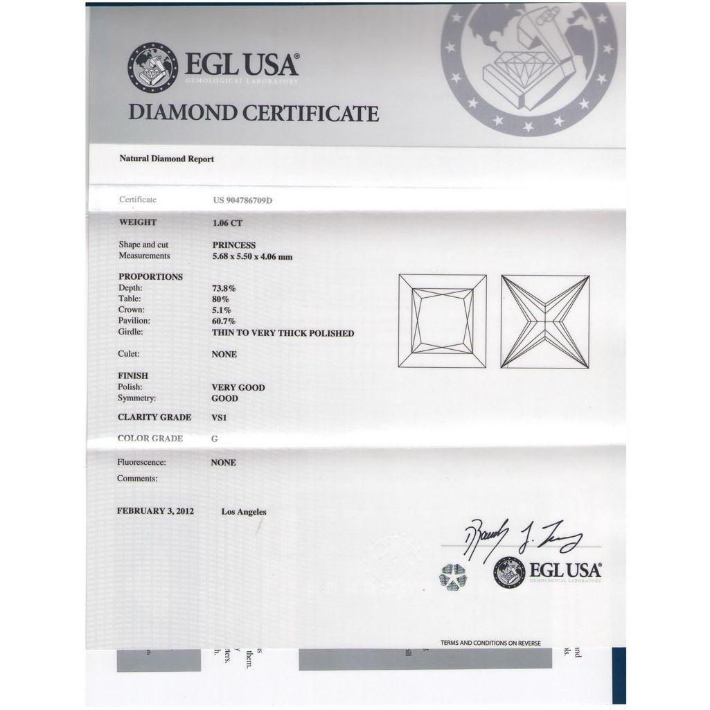 EGL USA 1.06 ctw Certified Princess Brilliant Diamond G **|**|** Certification: EGL USA; Total CTW: 1.06 ; Shape: Princess ; Color: G; Clarity: VS1 ; Pol: V G; Sym: G; Flour: None ; Meas.: 5.68x5.50x4.06 ; Depth: 73.8 ; Table: 80 ; Girdle: Thin ; MSRP: $14100
