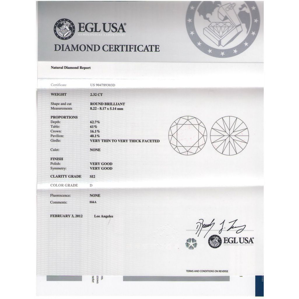 EGL USA 2.32 ctw Cert Round Brilliant Diamond D,SI2 **|**|** Certtification: EGL USA ; Shape: Round Brilliant ; Stone: Diamond ; Diamond Color: D ; Clarity: SI2 ; Cut: V G ; Pol: V G ; Sym: V G ; Flour: None ; Meas: 8.17-8.22x5.14 ; Depth: 62.7 ; Table: 61 ; Girdle: V Thin ; Comment: EYECLEAN, H & A ; MSRP: $46700