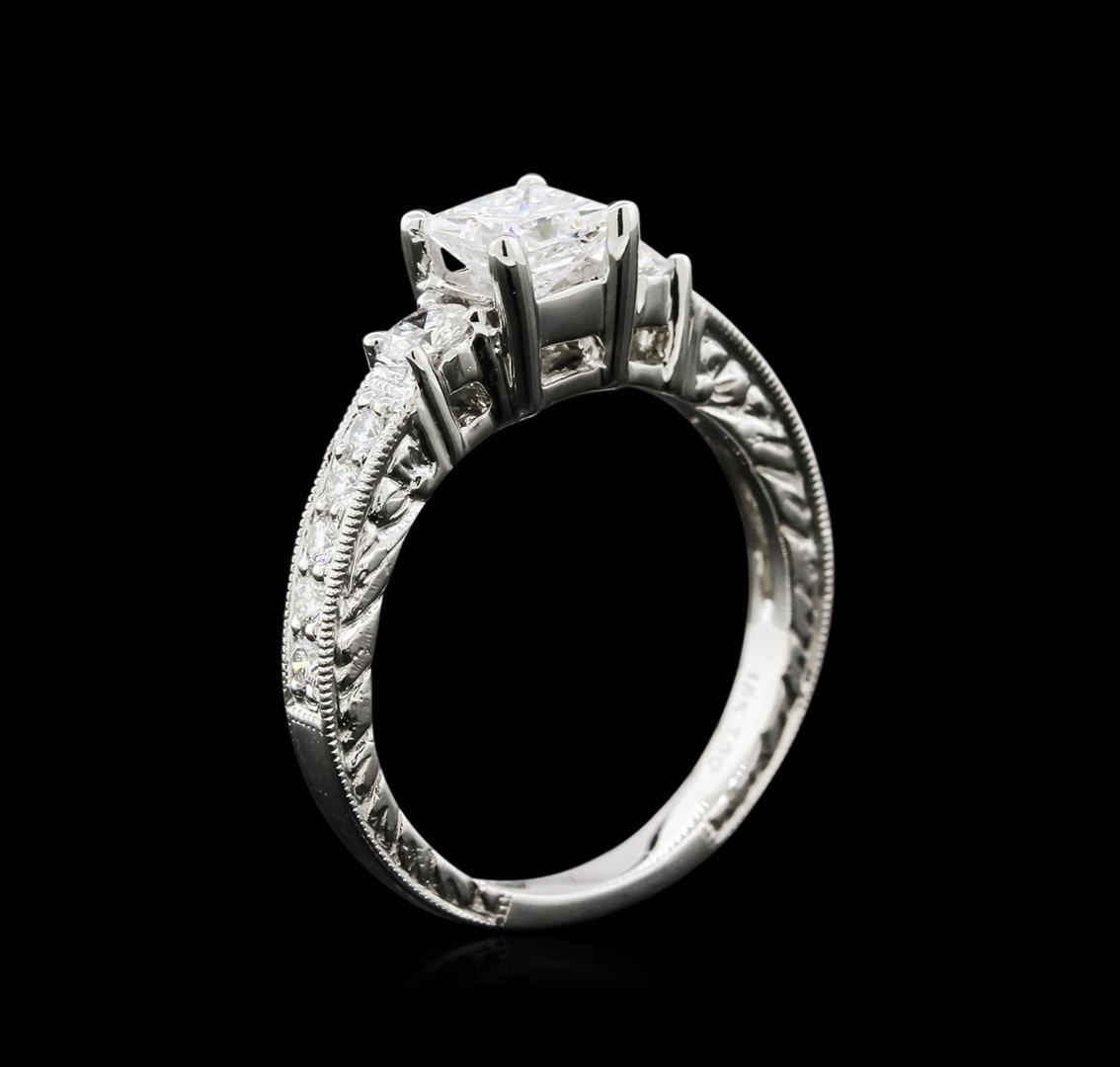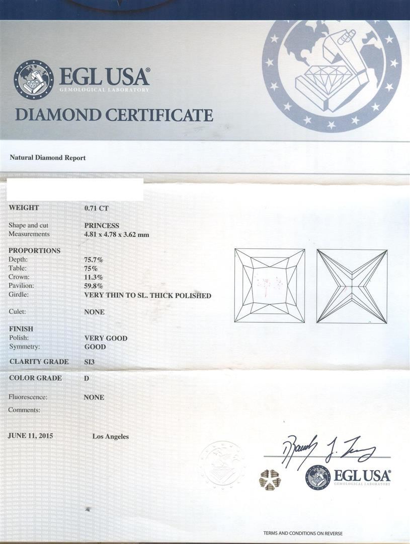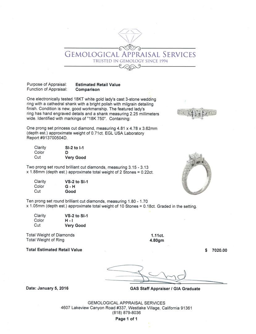 One electronically tested 18KT white gold lady's cast 3-stone wedding ring with a cathedral shank with a bright polish with milgrain detailing finish. The featured lady's ring has hand engraved details and a shank measuring 2.25 millimeters wide. Identified with markings of "18K 750". Condition is new, good workmanship. Containing: One prong set princess cut diamond, measuring 4.81 x 4.78 x 3.62mm (depth est.) approximate weight of 0.71ct. EGL USA Laboratory Report #913700504D. Clarity: SI-2 to I-1. Color: D. Cut Very Good Two prong set round brilliant cut diamonds, measuring 3.15 - 3.13 x 1.88mm (depth est.) approximate total weight of 2 Stones = 0.22ct. Clarity: VS-2 to SI-1. Color: G - Good Ten prong set round brilliant cut diamonds, measuring 1.80 - 1.70 x 1.05mm (depth est.) approximate total weight of 10 Stones = 0.18ct. Graded in the setting. Clarity: VS-2 to SI-1. Color: H - I. Cut Very Good. Total Weight of Diamonds 1.11ct. Total Weight of Ring 4.80gm. GAS Appraised at $7,020.00.
