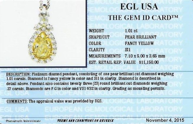 One pendant with chain featuring: platinum consisting of one pear brilliant cut diamond measuring 7.10 x 5.00 x 3.65mm weighing 1.01ct. Diamond is fancy yellow in color and SI1 in clarity. Pendant also contains twenty three (23) round brilliant cut diamonds weighing 0.27ct. Diamonds are F-G in color and VS1-VS2 in clarity. Grading as mounting permits. EGL USA Appraised.