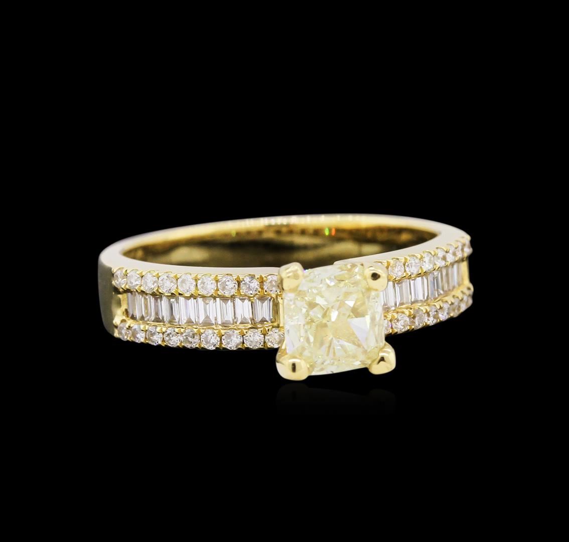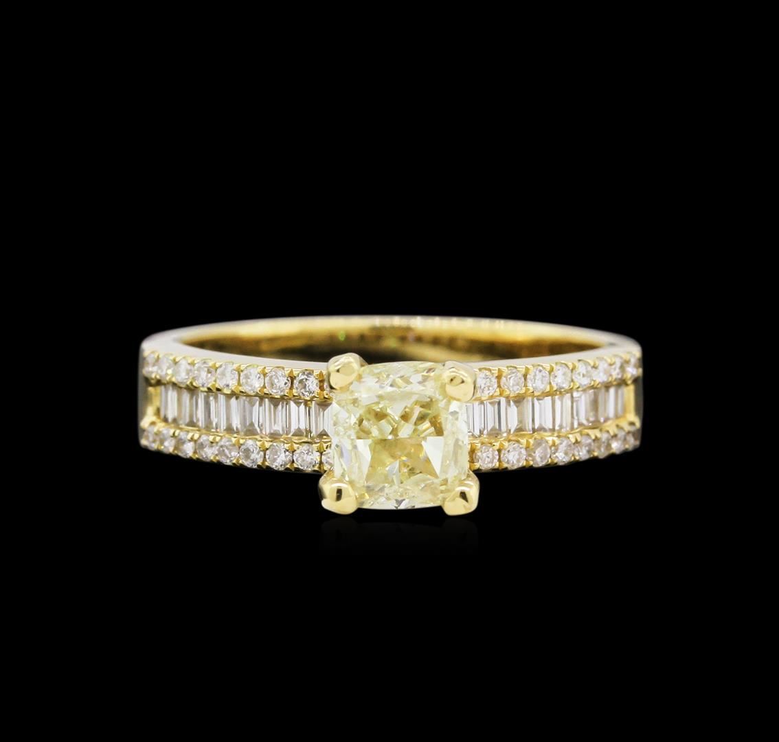 One electronically tested 18KT yellow gold ladies cast diamond unity ring with a bright polish finish. The featured diamond is supported by elaborate diamond set shoulders, completed by a two and one-half millimeter wide band. Identified with markings of "18K 750". Condition is new, good workmanship. Containing: One prong set cushion cut diamond, measuring 5.64 x 5.22 x 3.58mm exact weight 1.00ct. EGL Report attached. Graded loose prior to setting in the EGL Laboratory Report #US 905408319D. Clarity: SI-1. Depth: 68.6%. Table 64.2%. Pavil. Depth%. 41.8%. Crown Angle 44.0 Degrees Fifty-Four prong and channel set round brilliant & baguette cut diamonds approximate total weight of 54 Stones = 0.39ct. The clarity grade reflects the entire range of clarity for this group. Graded in the setting. Clarity: VS-1 to SI-1. Color: G - I. Total Weight of Diamonds 1.39ct. AIG Appraised at $17,545.00.