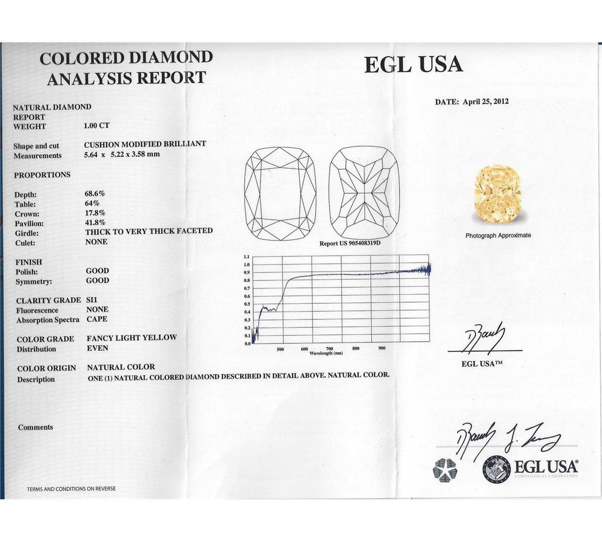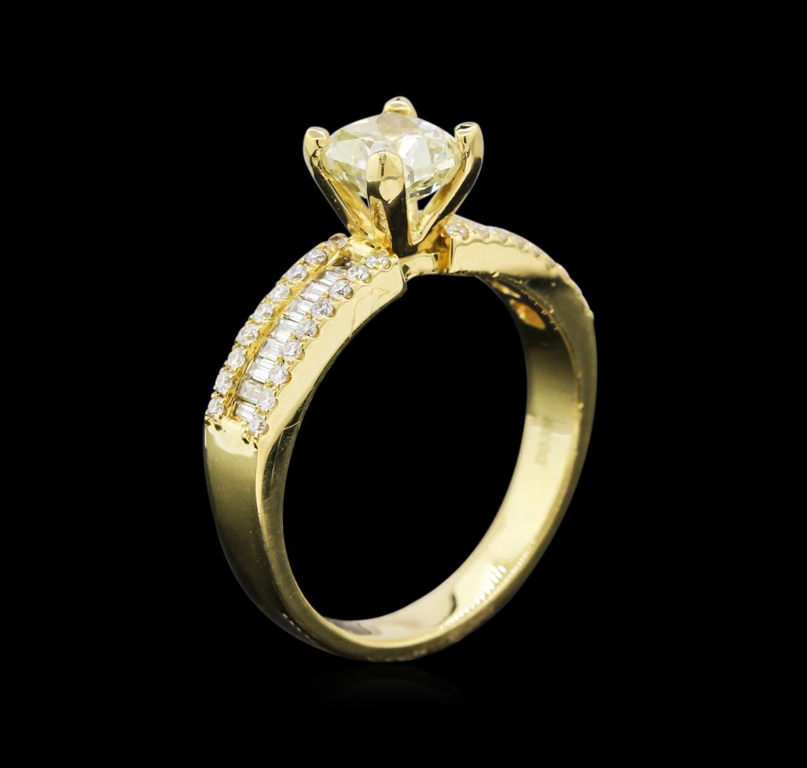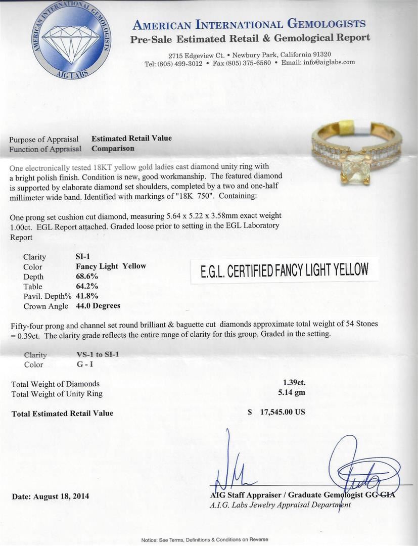 One electronically tested 18KT yellow gold ladies cast diamond unity ring with a bright polish finish. The featured diamond is supported by elaborate diamond set shoulders, completed by a two and one-half millimeter wide band. Identified with markings of "18K 750". Condition is new, good workmanship. Containing: One prong set cushion cut diamond, measuring 5.64 x 5.22 x 3.58mm exact weight 1.00ct. EGL Report attached. Graded loose prior to setting in the EGL Laboratory Report #US 905408319D. Clarity: SI-1. Depth: 68.6%. Table 64.2%. Pavil. Depth%. 41.8%. Crown Angle 44.0 Degrees Fifty-Four prong and channel set round brilliant & baguette cut diamonds approximate total weight of 54 Stones = 0.39ct. The clarity grade reflects the entire range of clarity for this group. Graded in the setting. Clarity: VS-1 to SI-1. Color: G - I. Total Weight of Diamonds 1.39ct. AIG Appraised at $17,545.00.