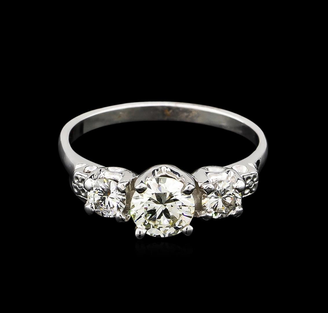 One electronically tested platinum ladies cast & assembled diamond ring with a bright polish finish. Condition is good. The featured diamond is set within a 14KT white gold section supported by diamond set platinum shoulders and completed by a two millimeter wide platinum badn. Containing: One prong set round brilliant cut diamond, measuring 6.18 - 6.07 x 3.65mm exact weight of 0.85ct. Graded loose prior to setting in the EGL Laboratory, Report # US906174109D. Clarity: SI-2. Color: K. Depth: 59.6%. Table: 63.0%. Pavil Depth %: 43.9%. Two prong set round brilliant cut diamonds, measuring 4.00 - 3.90 x 2.37mm (depth est.) approximate total weight of 2 Stones = 0.55ct. Graded in the setting. Clarity: VS-1 to VS-2. Color: H - I. Total Weight of Diamonds: 1.40ct. Total Weight of Ring: 5.90 grams. AIG Appraised at $12,565.00.