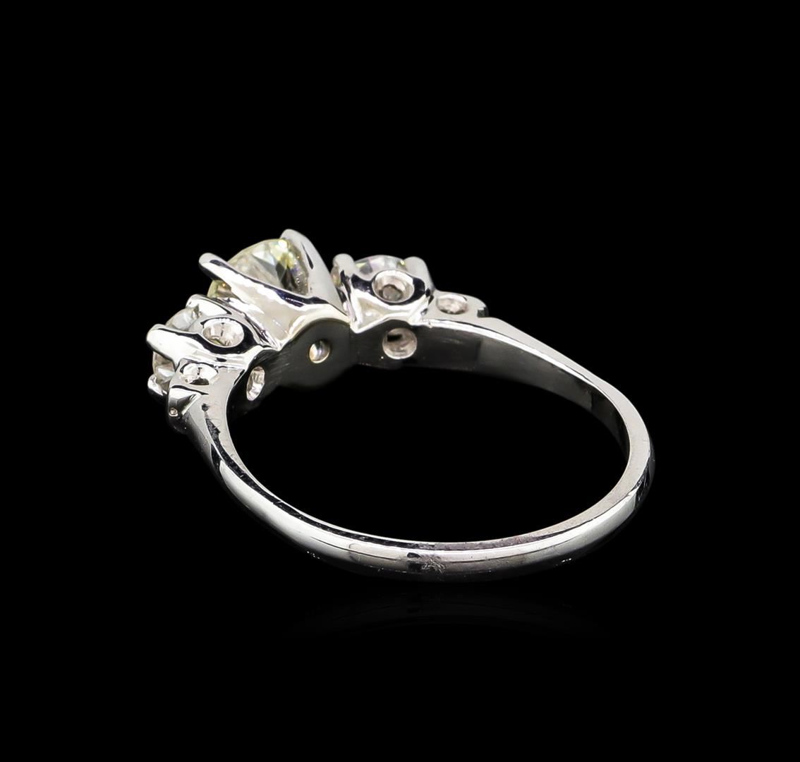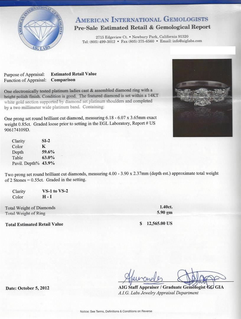 One electronically tested platinum ladies cast & assembled diamond ring with a bright polish finish. Condition is good. The featured diamond is set within a 14KT white gold section supported by diamond set platinum shoulders and completed by a two millimeter wide platinum badn. Containing: One prong set round brilliant cut diamond, measuring 6.18 - 6.07 x 3.65mm exact weight of 0.85ct. Graded loose prior to setting in the EGL Laboratory, Report # US906174109D. Clarity: SI-2. Color: K. Depth: 59.6%. Table: 63.0%. Pavil Depth %: 43.9%. Two prong set round brilliant cut diamonds, measuring 4.00 - 3.90 x 2.37mm (depth est.) approximate total weight of 2 Stones = 0.55ct. Graded in the setting. Clarity: VS-1 to VS-2. Color: H - I. Total Weight of Diamonds: 1.40ct. Total Weight of Ring: 5.90 grams. AIG Appraised at $12,565.00.