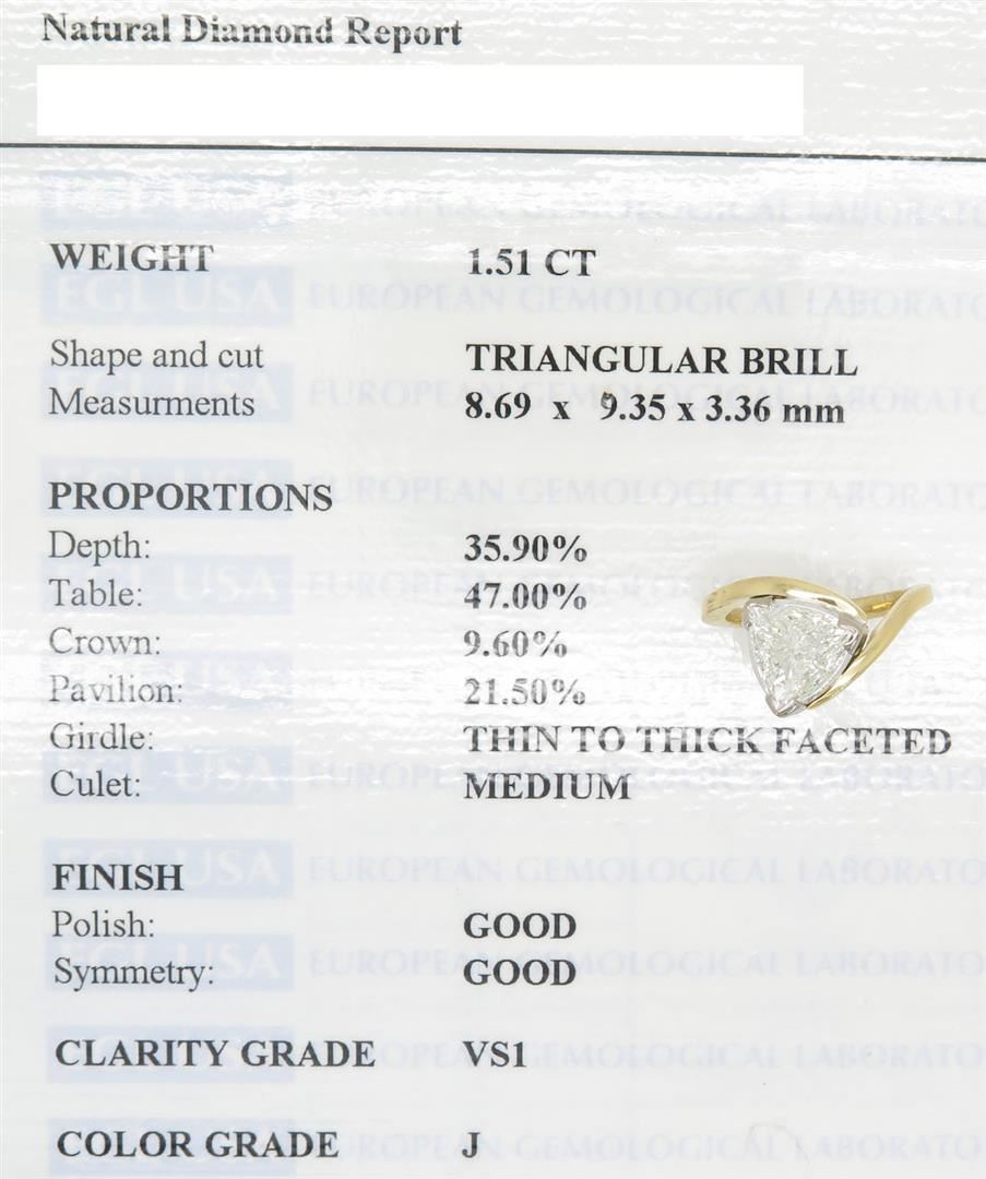 One tested 18K yellow gold certified diamond ring. Containing: 1 EGL Certified Trilliant Cut Diamond, Size: 1.51CT, Clarity: VS1, Color: J. All diamonds are graded in the mounting unless otherwise stated. Weight of ring: 5.6 grams, Size: 5.0 EGL USA Appraised.