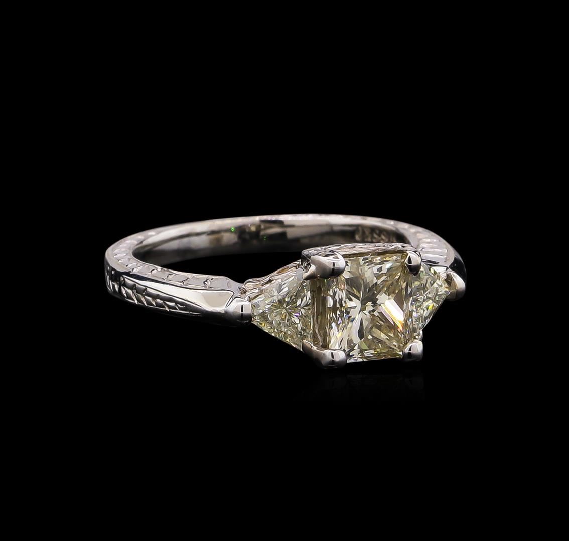 One electronically tested 14KT white gold lady's cast wedding ring with a cathedral shank with a bright polish, hand-engraved detail finish. Condition is new, good workmanship. The featured lady's ring has a shank measuring 2.26 millimeters wide. Identified with markings of 14K. Containing: One prong set princess cut diamond, measuring 6.18 x 5.51 x 4.29 mm (depth est.) approximate weight of 1.21ct. Clarity enhanced. Graded loose prior to the setting, EGL USA laser inscribed Report #US 908460205D. Clarity: SI-3; Color: J-K; Cut: Very Good. Two prong set triangle cut diamonds, measuring 4.40 x 4.30 x 2.67mm (depth est.) approximate total weight of 2 Stones = 0.57ct. Graded in the setting. Clarity: SI-1; Color: I-J; Cut: Very Good. Total Weight of Diamonds: 1.78 ct. Total Weight of Ring: 4.50gm. GAS Appraised at $6,790.00.