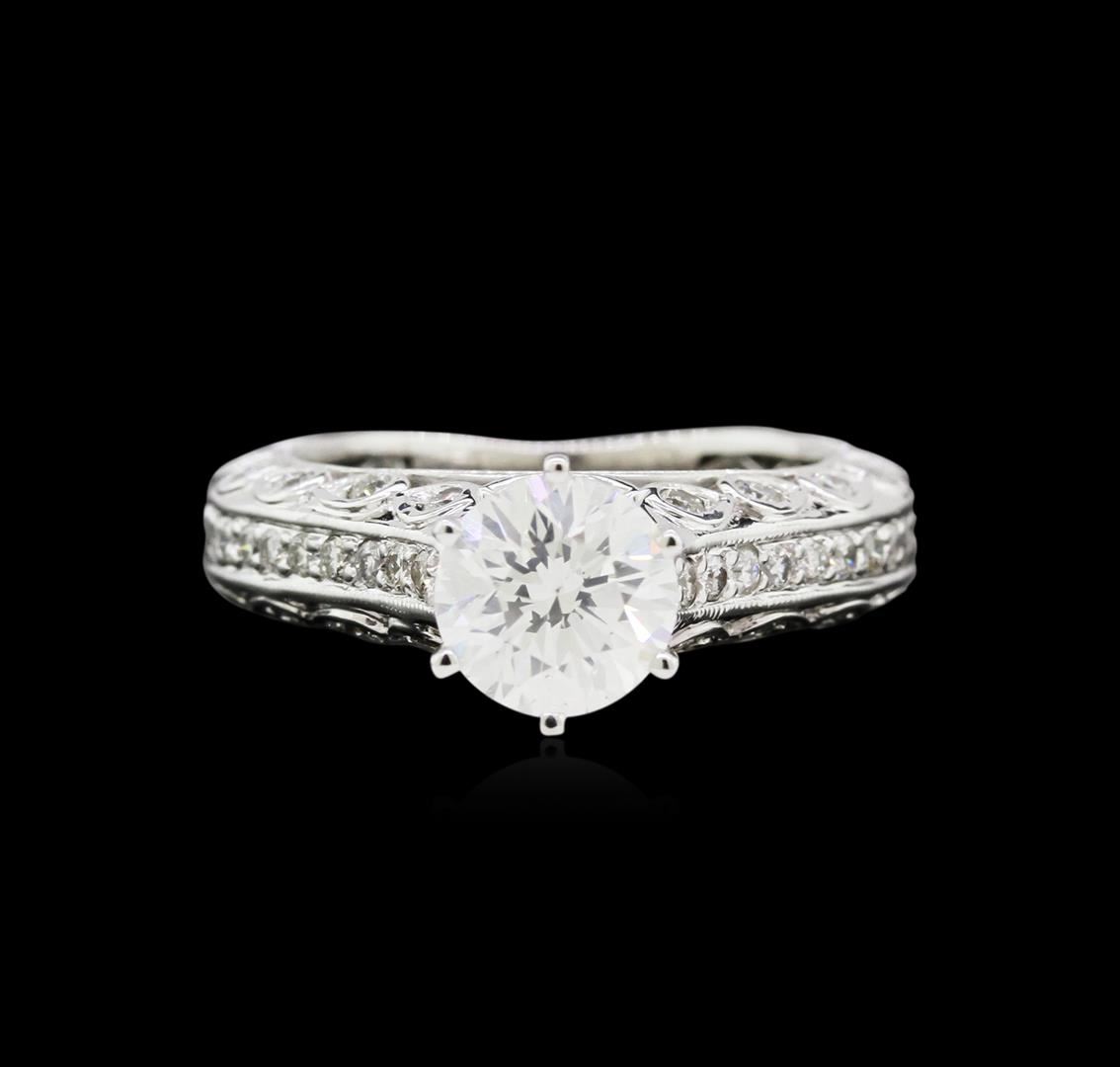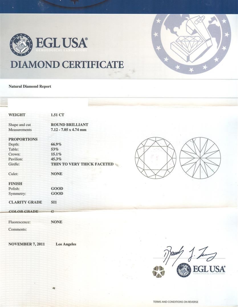 One electronically tested 14KT white gold lady's combination cast & assembled wedding ring with a straight line with a bright polish with milgrain detailing finish. The featured lady's ring has a shank measuring 3.76 millimeters wide. Condition is new, good workmanship. Containing: One prong set round brilliant cut diamond, measuring 7.12 - 7.05 x 4.74mm (depth est.) approximate weight of 1.51ct. EGL USA Laboratory Report #904140609. Clarity: SI-1. Color: Good Eighteen prong set round brilliant cut diamonds, measuring 1.80 - 1.75 x 1.10mm (depth est.) approximate total weight of 18 Stones = 0.40ct. Graded in the setting. Clarity: VS-2 to SI-2. Color: G - Good Twenty prong set round brilliant cut diamonds, measuring 1.50 - 1.40 x 0.90mm (depth est.) approximate total weight of 20 Stones = 0.23ct. Graded in the setting. Clarity: SI-1 to I-1. Color: G - Good. Total Weight of Diamonds 2.14ct. Total Weight of Ring 7.60gm. GAS Appraised at $30,500.00.