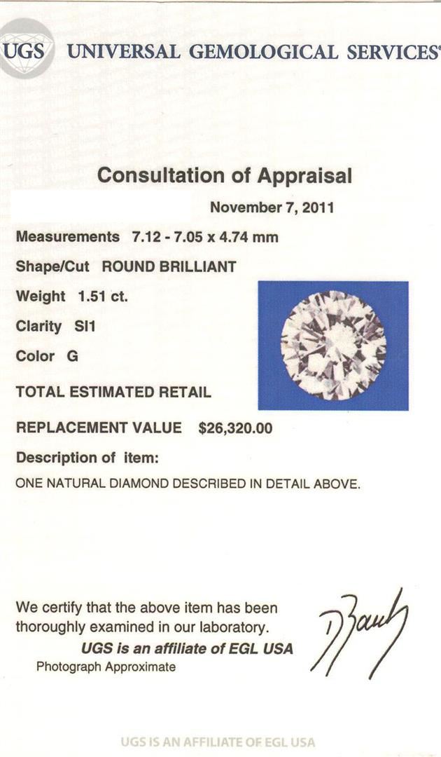 One electronically tested 14KT white gold lady's combination cast & assembled wedding ring with a straight line with a bright polish with milgrain detailing finish. The featured lady's ring has a shank measuring 3.76 millimeters wide. Condition is new, good workmanship. Containing: One prong set round brilliant cut diamond, measuring 7.12 - 7.05 x 4.74mm (depth est.) approximate weight of 1.51ct. EGL USA Laboratory Report #904140609. Clarity: SI-1. Color: Good Eighteen prong set round brilliant cut diamonds, measuring 1.80 - 1.75 x 1.10mm (depth est.) approximate total weight of 18 Stones = 0.40ct. Graded in the setting. Clarity: VS-2 to SI-2. Color: G - Good Twenty prong set round brilliant cut diamonds, measuring 1.50 - 1.40 x 0.90mm (depth est.) approximate total weight of 20 Stones = 0.23ct. Graded in the setting. Clarity: SI-1 to I-1. Color: G - Good. Total Weight of Diamonds 2.14ct. Total Weight of Ring 7.60gm. GAS Appraised at $30,500.00.