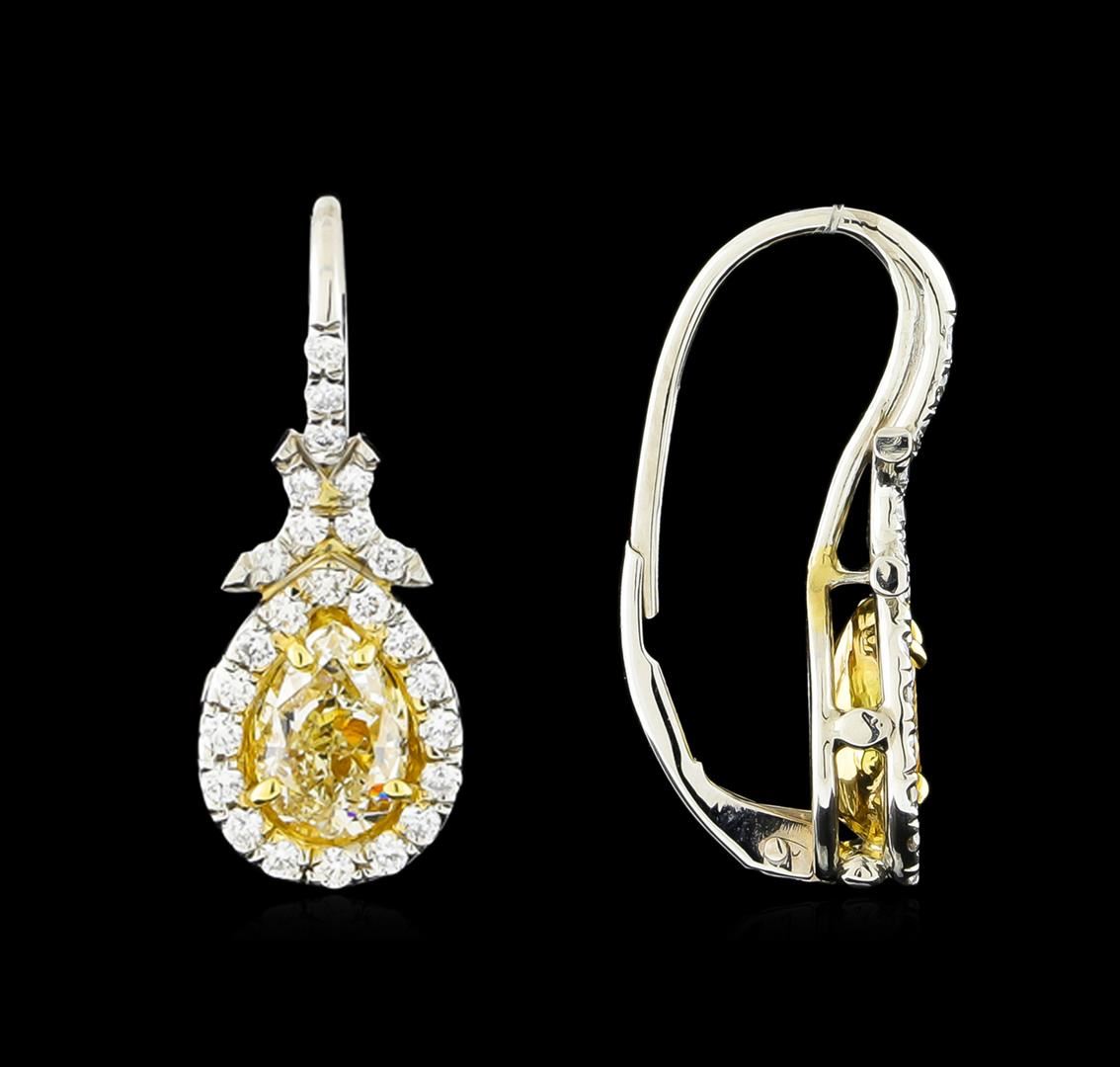 One pair of earrings featuring: platinum consisting of two (2) pear brilliant cut diamonds measuring 7.50 x 5.00 x 3.57mm weighing 2.03ct. Diamonds are fancy light to fancy yellow in color and VS2 in clarity. The earrings also contain fifty (50) round brilliant cut diamonds weighing 0.59ct. Diamonds are G-H in color and VS1-VS2 in clarity. Grading as mounting permit. EGL USA Appraised.