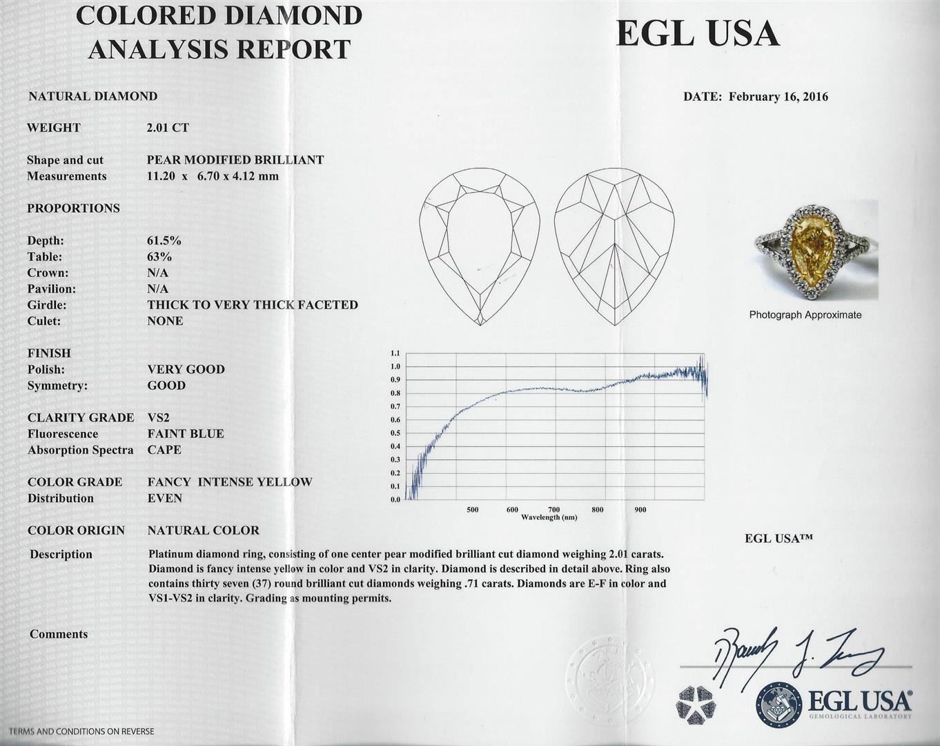 One ring featuring: platinum consisting of one center pear modified brilliant cut diamond measuring 11.20 x 6.70 x 4.12mm weighing 2.01ct. Diamond is fancy intense yellow in color and VS2 in clarity. Ring also contains thirty seven (37) round brilliant cut diamonds weighing 0.71ct. Diamonds are E-F in color and VS1-VS2 in clarity. Grading as mounting permits. EGL USA Appraised.