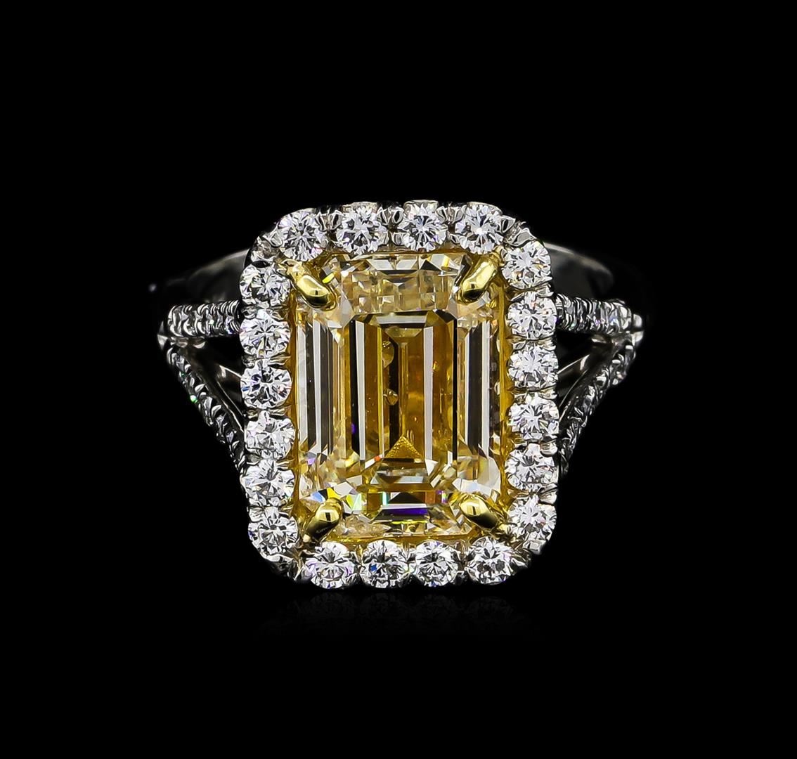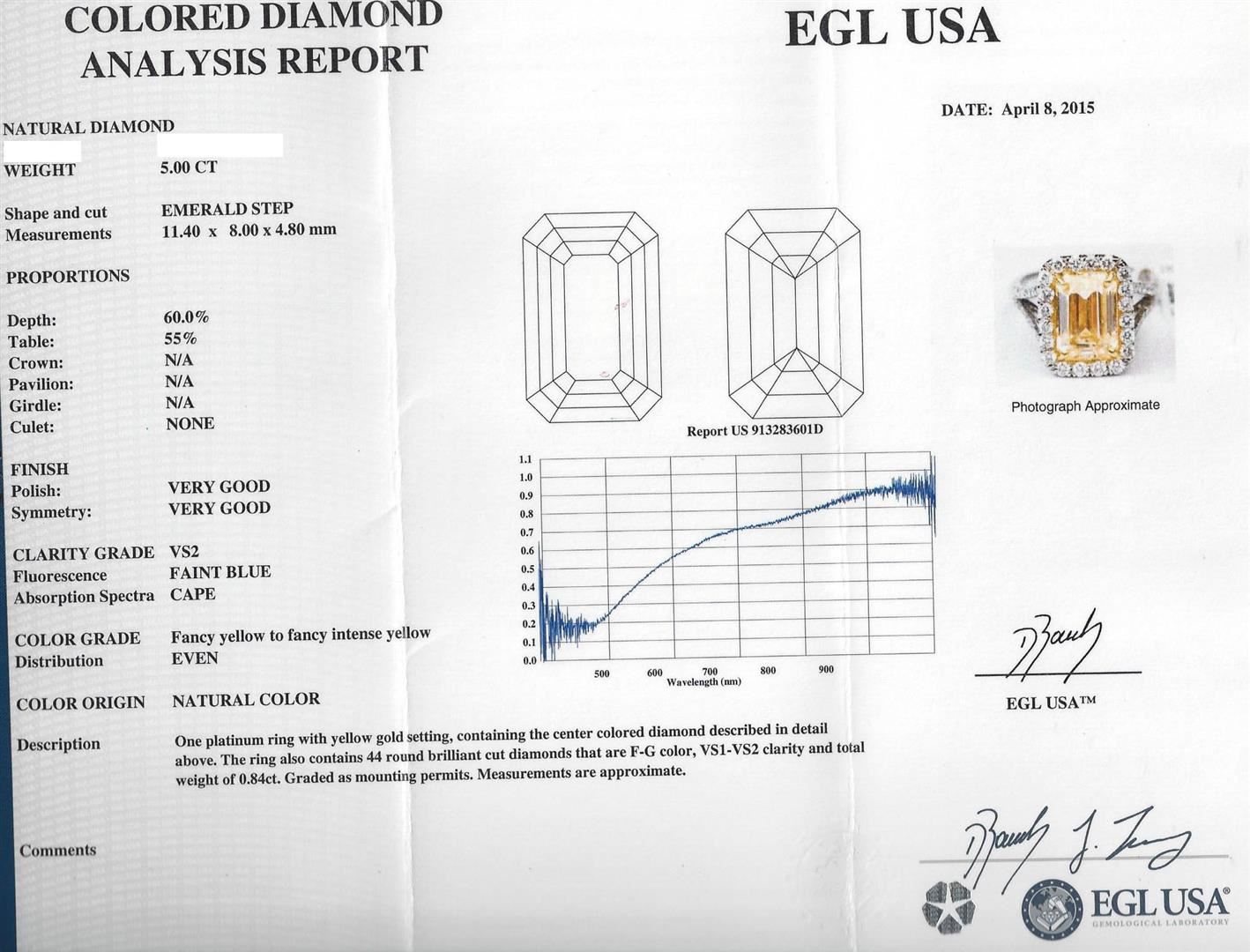 One electronically tested 18KT-platinum white and yellow gold lady's combination cast & assembled wedding ring with a split shank halo with a bright polish finish. The featured lady's ring has a shank measuring 2.60 millimeters wide. Identified with markings of "PT 900". Condition is new, good workmanship. Containing: One prong set emerald cut diamond, measuring 11.40 x 8.00 x 4.80mm (depth est.) approximate weight of 5.00ct. EGL USA Laboratory Report #913283601D. Clarity: VS-2 Cut Very Good Twenty prong set round brilliant cut diamonds, measuring 2.00 - 1.90 x 1.21mm (depth est.) approximate total weight of 20 Stones = 0.60ct. Graded in the setting. Clarity: VS-1 to VS-2. Color: F - G. Cut Very Good Twenty-Four prong set round brilliant cut diamonds, measuring 1.40 - 1.35 x 0.86mm (depth est.) approximate total weight of 24 Stones = 0.24ct. Graded in the setting. Clarity: VS-1 to VS-2. Color: F - Very Good. Total Weight of Diamonds 5.84ct. Total Weight of Ring 9.90gm. GAS Appraised at $162,360.00.