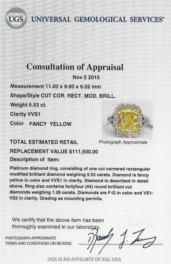 One ring featuring: platinum consisting of one cut cornered rectangular modified brilliant diamond measuring 11.00 x 9.00 x 6.02mm weighing 5.53ct. Diamond is fancy intense yellow in color and VVS1 in clarity. Ring also contains forty four (44) round brilliant cut diamonds weighing 1.26ct. Diamonds are F-G in color and VS1-VS2 in clarity. Grading as mounting permits. EGL USA Appraised.